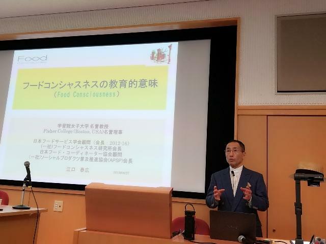 講座は、"全ての行動の原点は意識(Consciousness)することから始まる"という"江口語録"から始まり、フードコンシャスネスは食を積極的に意識することであるとして、その教育的特徴を分かりやすく解説されました。
